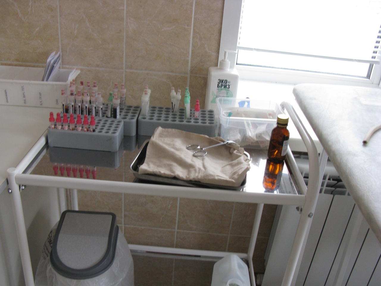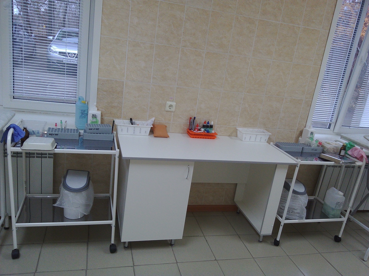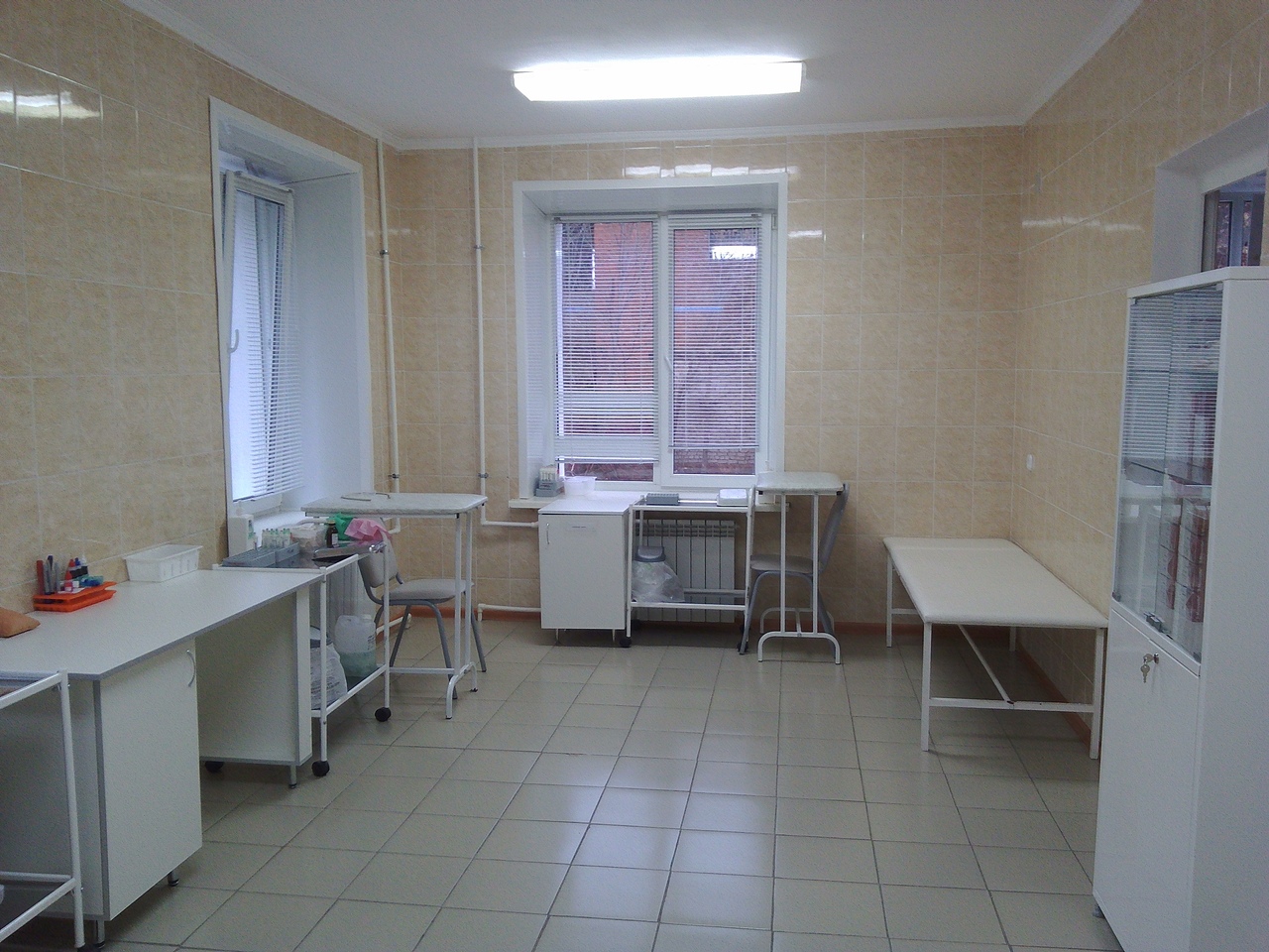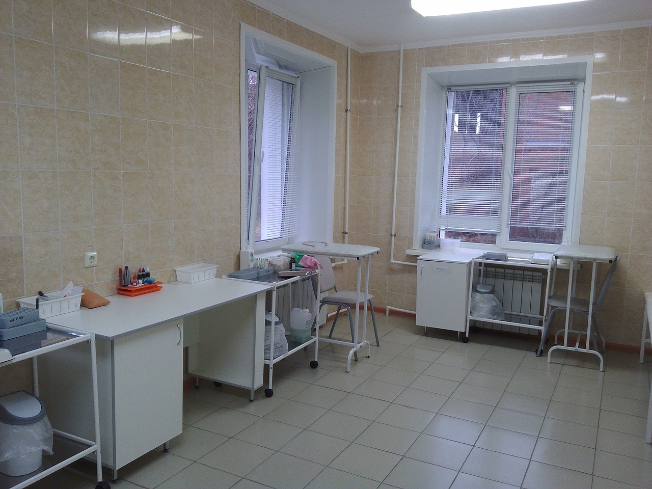 Кабинет № 105 состоит из двух совмещенных кабинетов (кабинет забора венозной и капиллярной крови). Кабинет № 106- кабинет приема биоматериала. Помещения полностью отремонтированы согласно СанПин 2.3.1.2630-10, закуплена новая мебель, проведено интернет подключение компьютера к системе РИАМС ПроМед, что позволит сократить время забора крови, исключить ведение ненужных журналов, даст возможность быстрого составления отчетов.